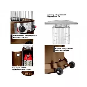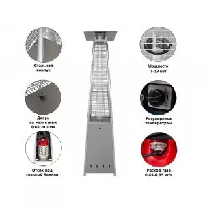 Газовые обогреватели для улицы – современное и энергоэффективное решение, специально разработанное для больших открытых площадок. Для обслуживания используются газовые баллоны, объем которых зависит от модели. При нагреве сетка дополнительно излучает приятный красноватый свет, повышая комфорт отдыха.